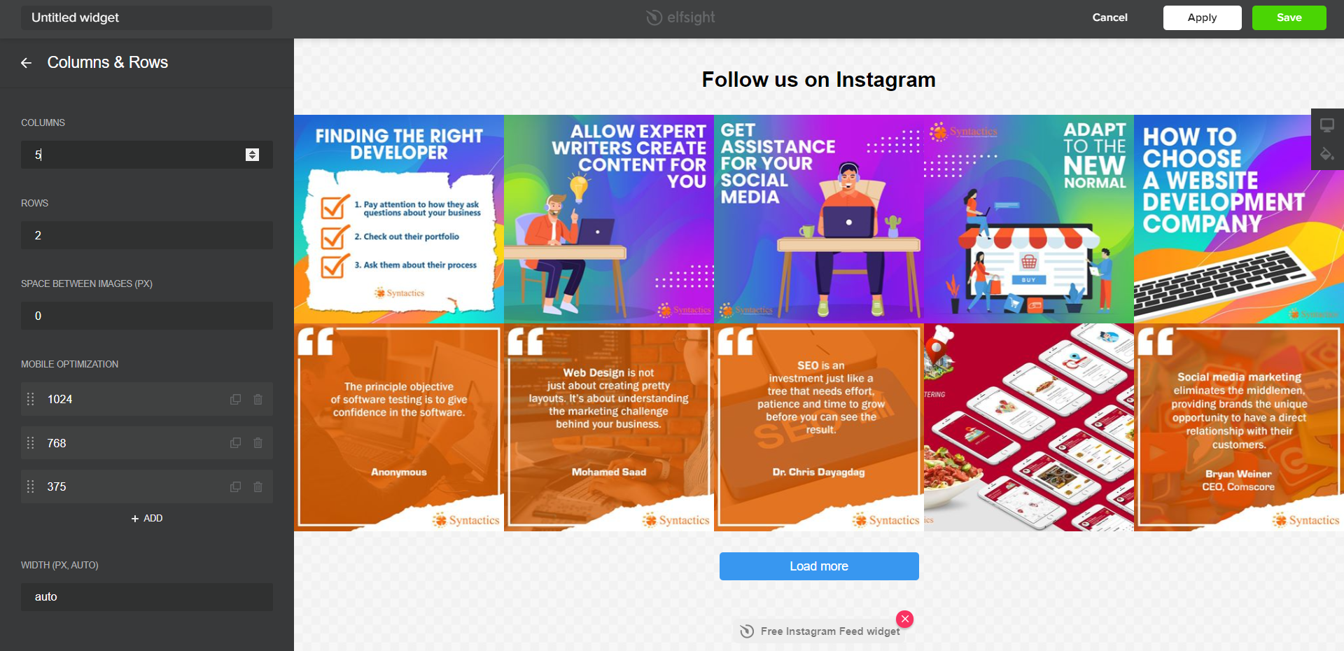 Next, you should determine the number of columns and rows for the widget, adjust the spaces between images, and even optimize the feed for mobile users.