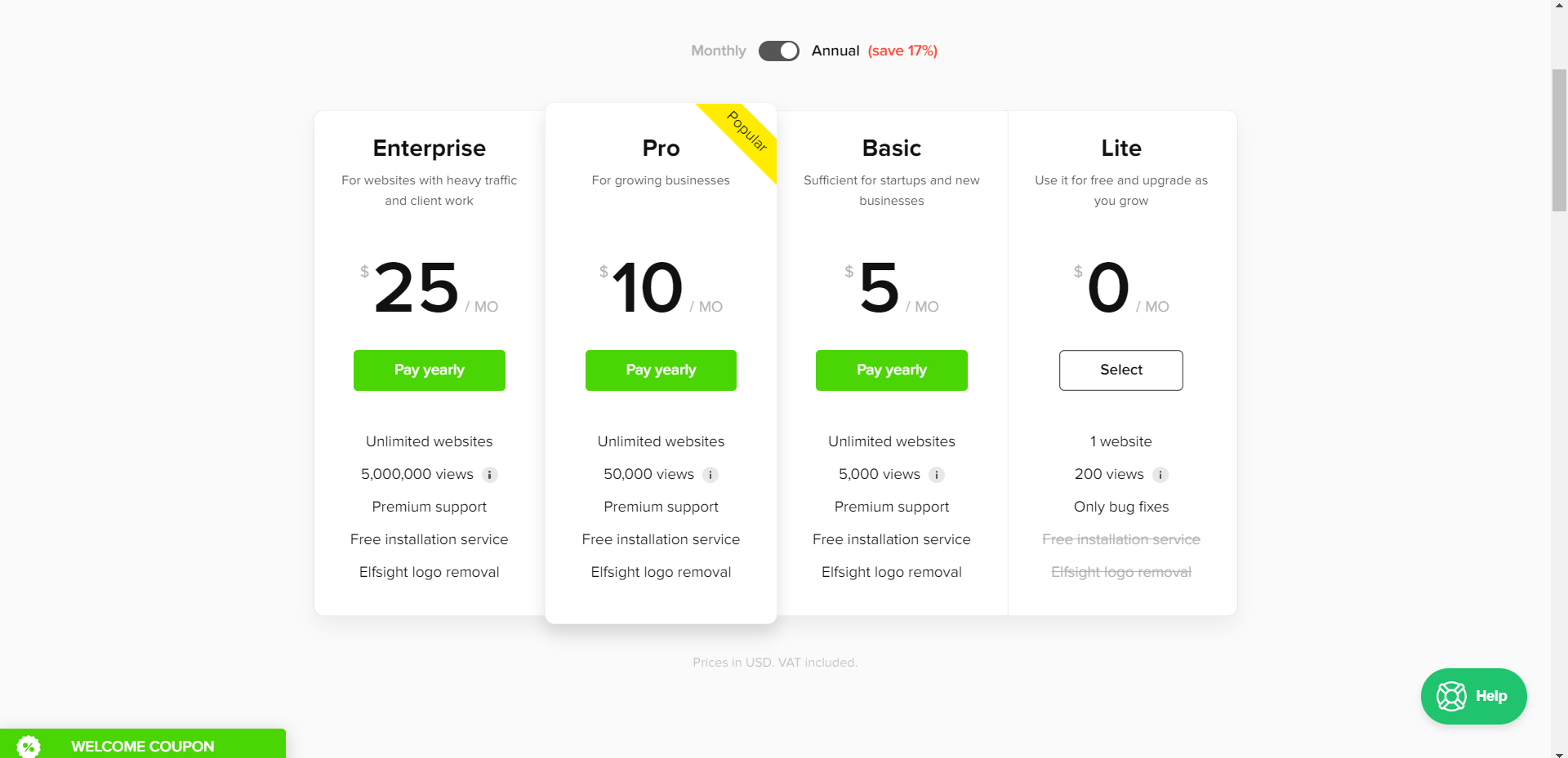 Elfsight provides you with four options in choosing your Instagram Feed plan. We suggest that you select their Lite version first to try out their services for free. Then, see if it suits your business needs.